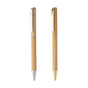 Bolígrafo con barril de bambú y detalles en metal cromado, tinta de escritura azul.