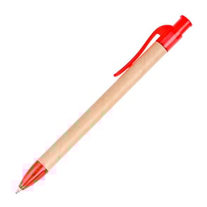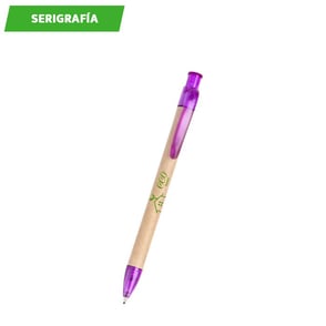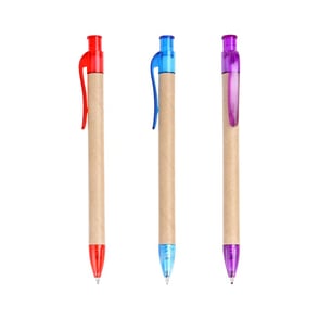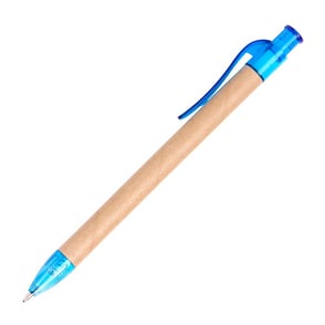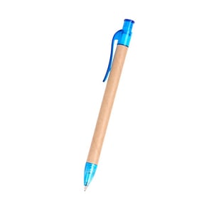 Bolígrafo ecológico, barril de cartón con accesorios de plástico translúcido y tinta negra.